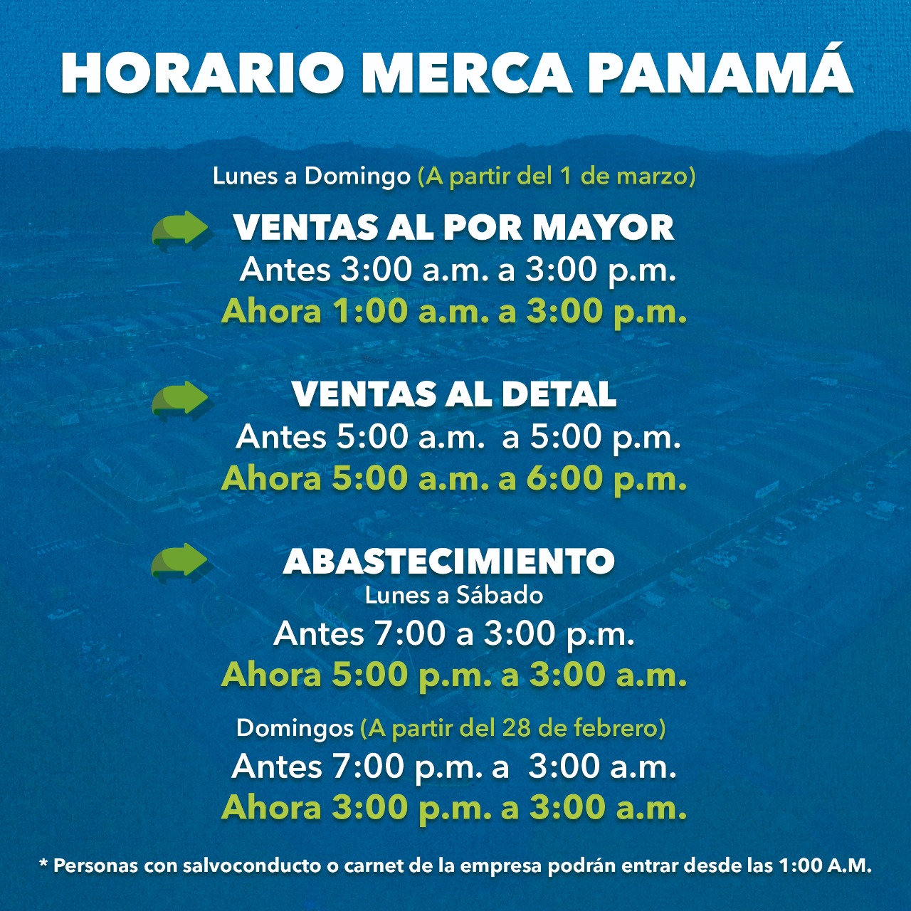 Mercados Nacionales de la Cadena de Frío S.A. anuncia que, a partir de la fecha, Merca Panamá extiende horario de atención a sus clientes, de lunes a domingo. Las ventas al por mayor de 1:00 a.m. a 3:00 p.m.; y ventas al detal de 5:00 a.m. a 6:00 p.m.